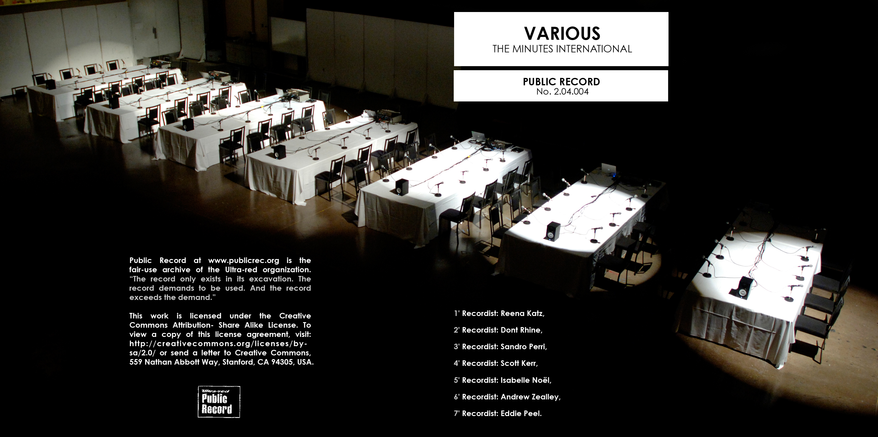 For the performance of SILENT|LISTEN in recognition of the XVI International AIDS Conference, Ultra-red enlisted five Toronto-based electronic musicians. This album compiles the minutes of that performance with original tracks by Reena Katz, Scott Kerr (Kids On TV), Isabelle Noel (Miau Miau TM), Eddie Peel (Death Drive/Ultra-red), Sandro Perri (Polmo Polpo), Dont Rhine (Jack Tactic/Ultra-red), and Andrew Zealley (PS Beuys).