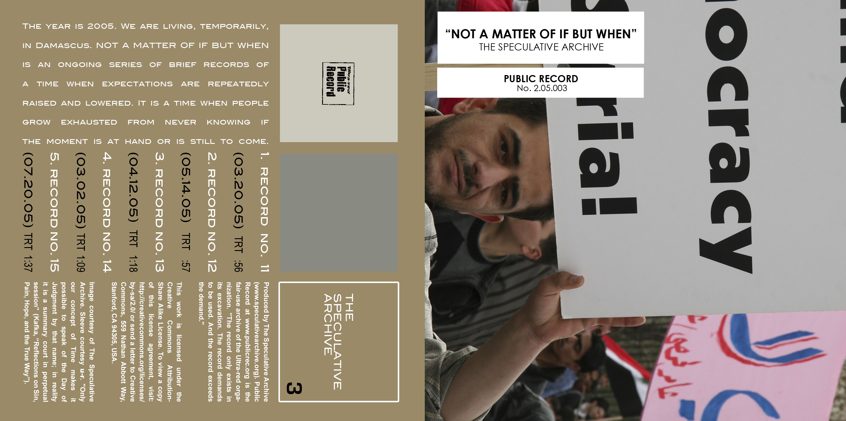 The third and final compilation of video shorts from this groundbreaking series. Based on The Archive's yearlong residency in Damascus, "Not A Matter Of If But When" (subtitled: brief records of a time in which expectations were repeatedly raised and lowered and people grew exhausted from never knowing if the moment was at hand or was still to come) is a three-part series of compiled video shorts documenting a time when expectations are repeatedly raised and lowered. It is a time when people grow exhausted from never knowing if the moment is at hand or is still to come.